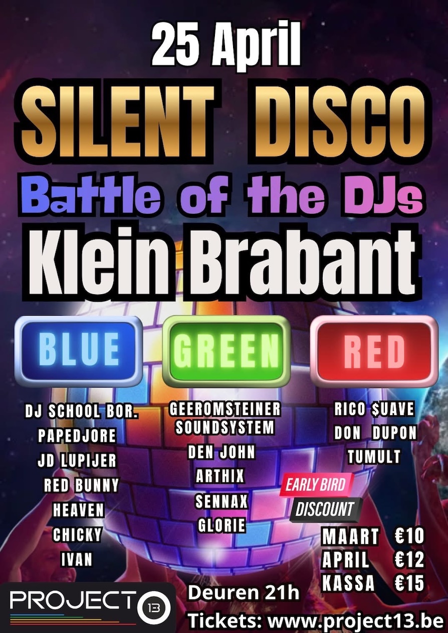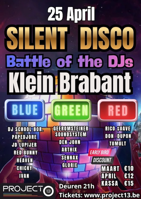 Op Zaterdag 25 April wordt er gebattled tussen de verschillende DJ's van klein Brabant. Dit tijdens onze Silent disco party. Wie o wie laat zijn kleur het meeste overheersen in de zaal??